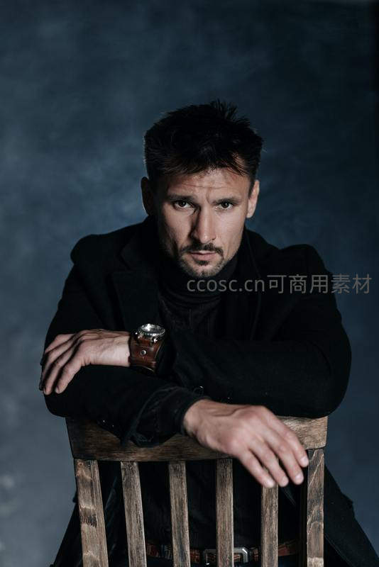 一名身着全黑服装的男子,双臂交叉倚靠在一张木质椅子上,眼神锐利地直视前方。背景为深蓝色调,搭配皮质手表,整体造型散发出成熟、酷帅且略带忧郁的气质。