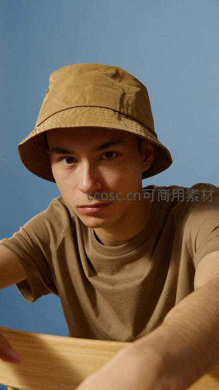 一位年轻男子头戴卡其色渔夫帽,身穿同色系T恤,在纯净蓝色背景下直视镜头,展现出自然随性的时尚感。