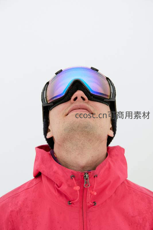 一名滑雪者头戴炫彩护目镜,身穿亮红色防寒服,仰头望向天空,捕捉了冬日运动中宁静而充满期待的瞬间。