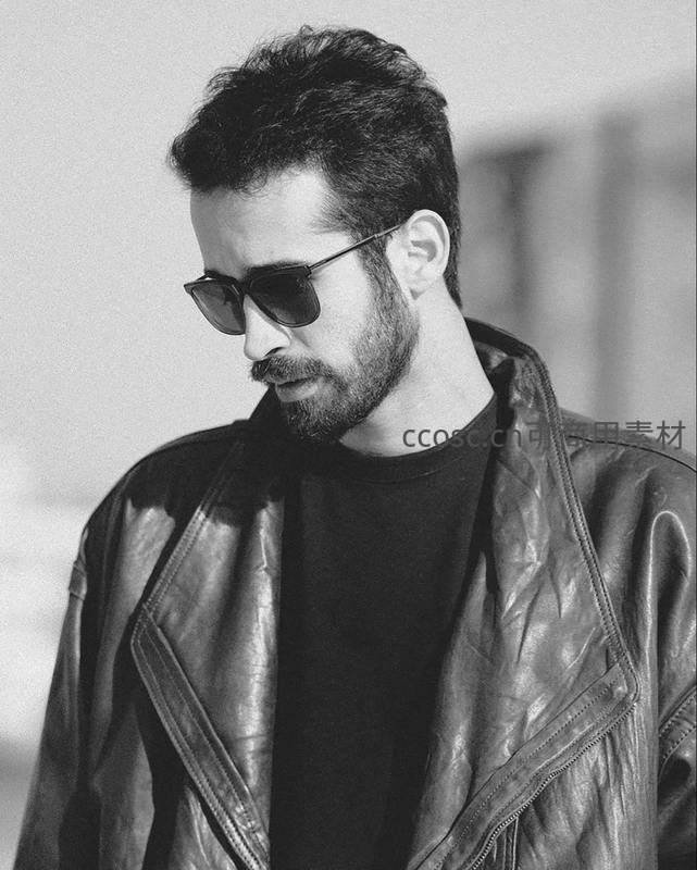 黑白照片中,一位留着胡须的男士身着皮夹克,佩戴墨镜,侧脸低垂目光,散发出酷帅不羁的街头时尚风格。