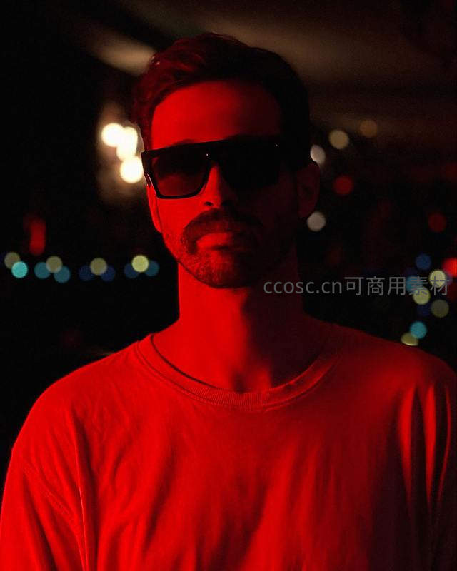 在浓郁的红色灯光笼罩下,一位戴着墨镜的男子神情冷峻,背景是模糊的城市霓虹,营造出强烈的视觉冲击与神秘感。