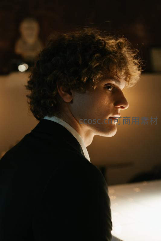柔和的暖光从侧面打亮一位年轻男子的侧脸,他卷发蓬松,身着正装,眼神专注而深邃,背景虚化,凸显其优雅与内敛气质。