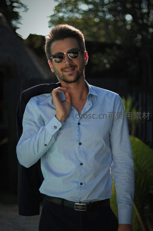 一位穿着浅蓝色衬衫的男士在户外阳光下微笑着,肩搭西装外套,佩戴太阳镜,展现出优雅与自信的商务休闲风格。