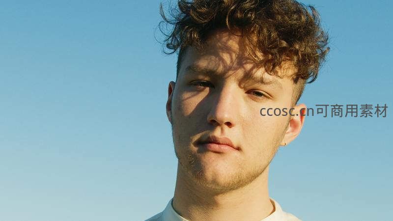 年轻男子在晴朗蓝天背景下,自然光洒在脸上,卷发蓬松,表情平静,呈现出清新自然、充满活力的青春气息。