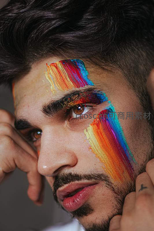 男子脸上绘有鲜艳的彩虹条纹彩妆,色彩浓烈且富有艺术感,他用手轻托下巴,眼神专注,整体画面充满创意与视觉冲击力。