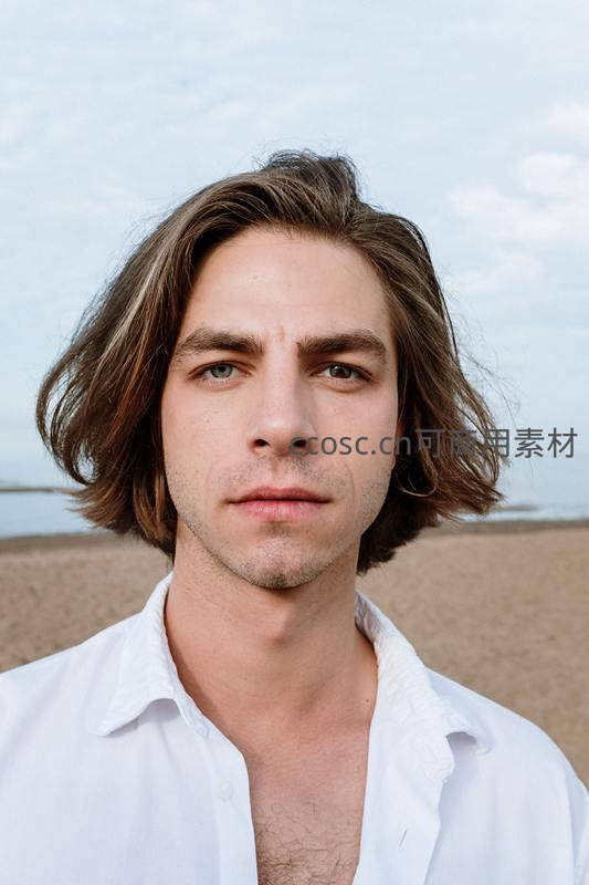 一位留着棕色中长发的年轻男子站在沙滩上,身穿白色衬衫,背景是柔和的天空与海面,神情沉静而专注。