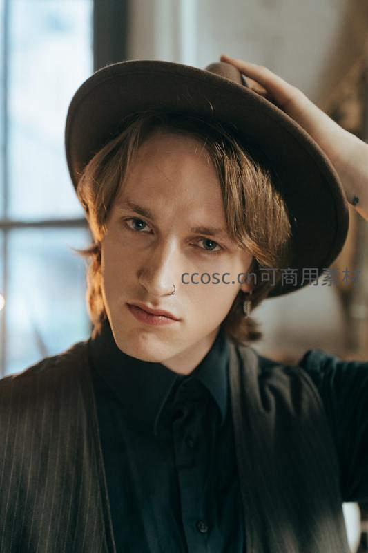 金发青年手扶礼帽,佩戴鼻环,身穿条纹马甲与黑色衬衫,侧脸在窗边柔光下显得文艺又带点叛逆气息。
