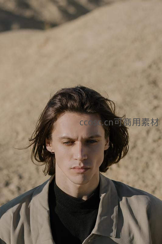 青年男子置身于沙丘背景前,微风吹拂发丝,身穿卡其色风衣与黑色高领衫,眼神低垂,氛围略带忧郁与孤独。