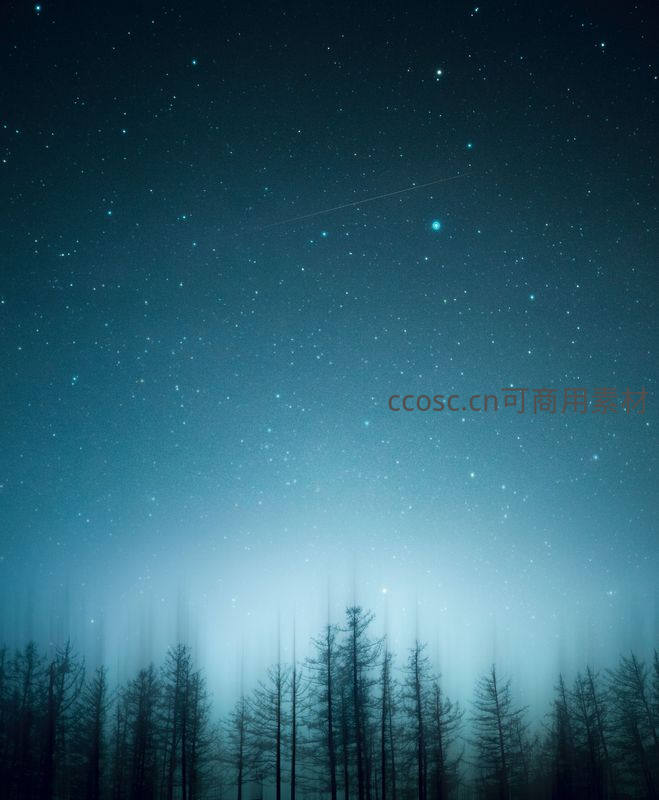 深邃的夜空中繁星点点,一道流星划过天际,下方是朦胧的森林剪影,营造出宁静而神秘的氛围。