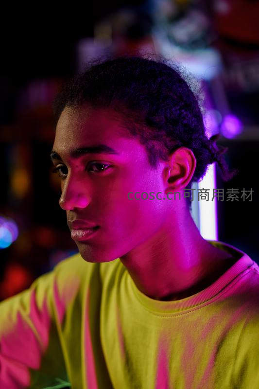 在紫色与粉色霓虹灯光映照下,一位青年侧脸轮廓清晰,眼神专注,背景模糊的都市夜景营造出迷幻而现代的氛围。