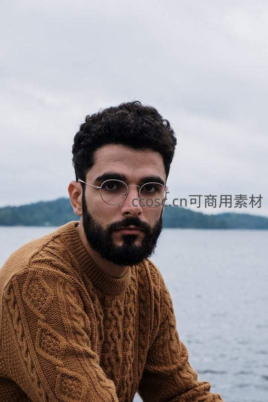 湖畔沉思的卷发男子,戴眼镜穿棕色毛衣