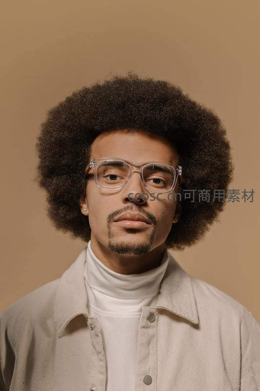 一位拥有蓬松爆炸头的青年,佩戴透明框架眼镜,内搭白色高领衫外罩浅色夹克,面对镜头神情平静,背景为统一米色调,整体风格简约现代,彰显独特个性与时尚品味。