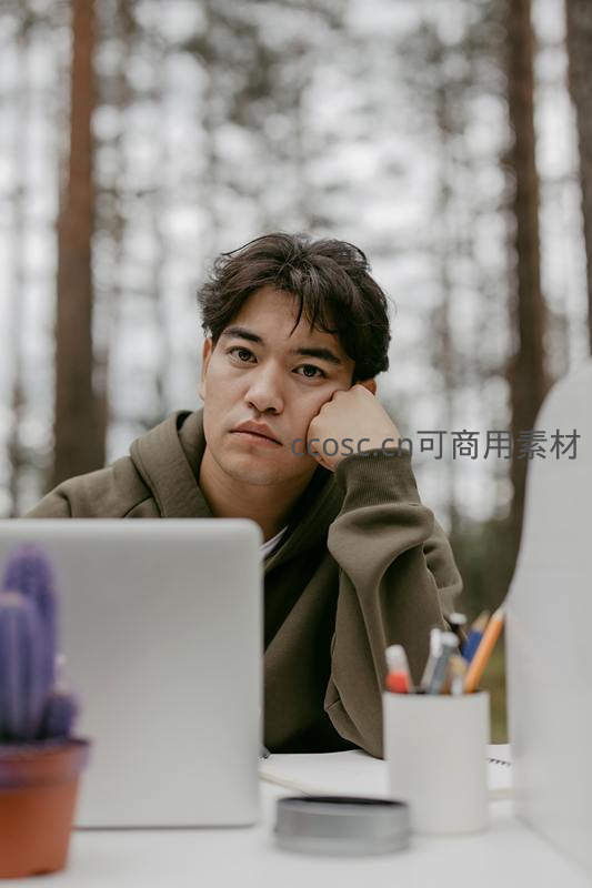 森林中工作的青年,手托下巴凝视电脑