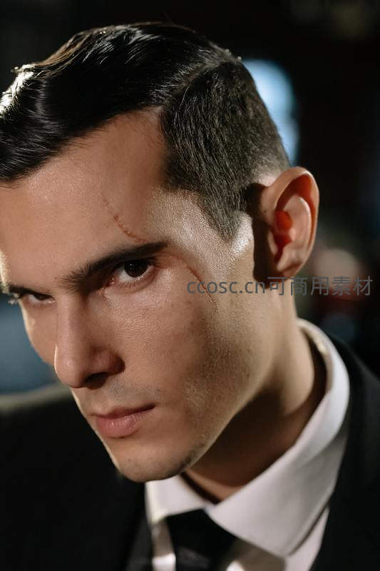 冷峻男模特写,眉骨伤痕增添硬朗魅力