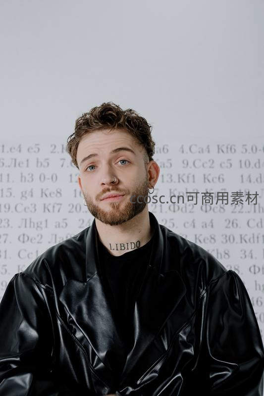 穿着黑色亮面皮衣的青年直视镜头,颈部“LIBIDO”纹身醒目,搭配鼻环与胡须,背景布满棋谱符号,整体风格前卫又具文化张力。