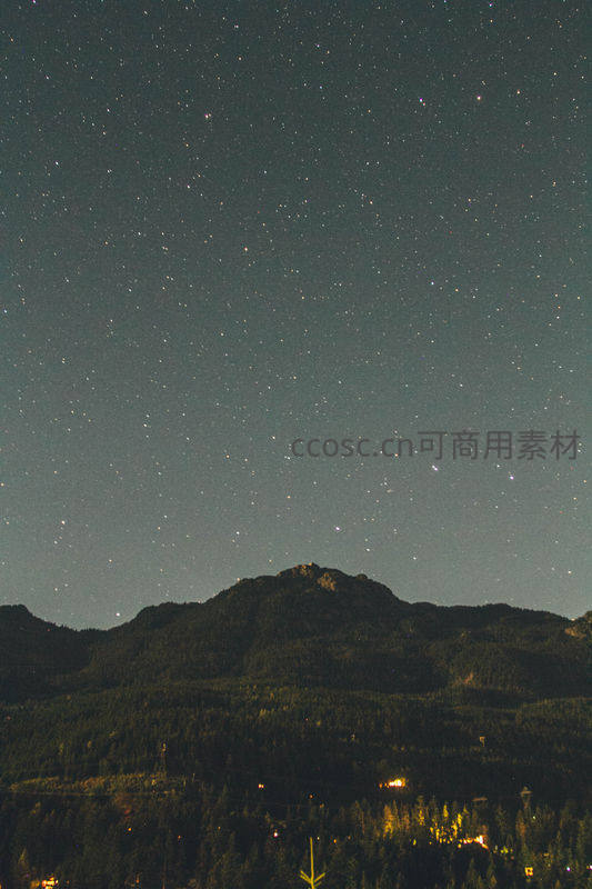 巍峨的山峦静卧于夜幕之下,头顶是浩瀚无垠的星海,山脚零星灯火闪烁,展现自然与人类文明的和谐共存。