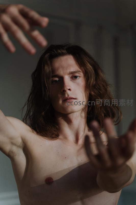 长发男子赤裸上身,在明暗交错的光线下伸展双臂,姿态充满张力与艺术感,展现身体线条与情绪表达,营造神秘而富有表现力的画面。