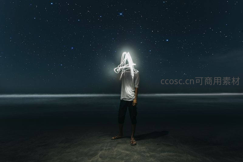 一个人站在寂静的沙滩上,头部被白色光轨勾勒成抽象图案,背景是浩瀚星空,充满未来感与哲学思考。