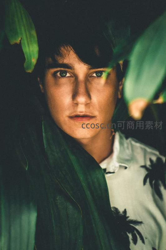 青年被大片绿色叶片环绕,目光直视镜头,衬衫上的棕榈树图案呼应环境,整体色调浓郁,充满自然与神秘气息。