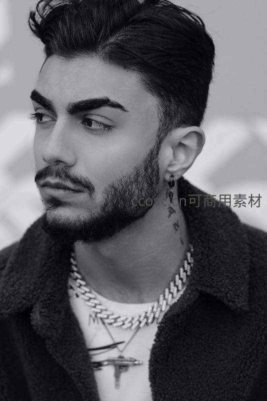 黑白调中,一位蓄着浓密胡须的年轻男子侧脸凝视远方,佩戴粗链条项链和耳环,颈部有小纹身,尽显街头潮流风格。