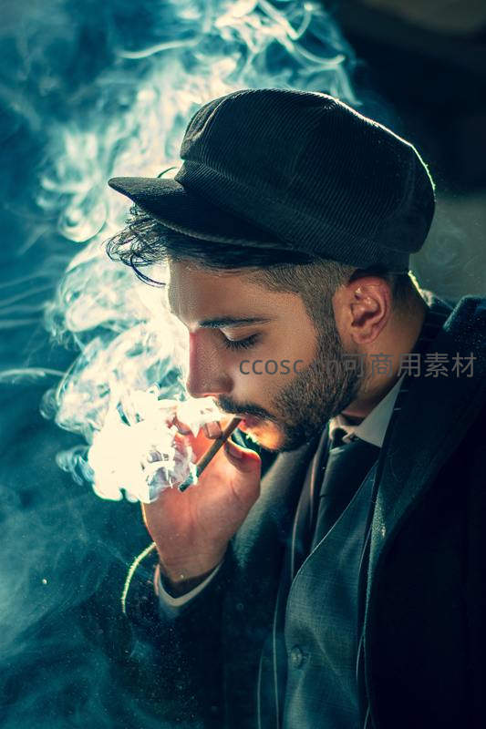 一位戴着报童帽、身穿西装的男子闭目抽烟,烟雾缭绕营造神秘氛围,柔和光线勾勒面部轮廓,充满电影感与怀旧气息。
