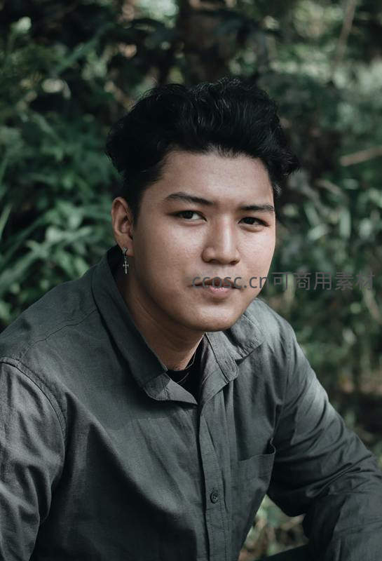 一位年轻男子在茂密绿植前凝视镜头,身穿深灰色衬衫,佩戴十字架耳钉,发型时尚,神情沉静而有力量。