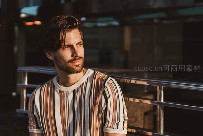 男子身着彩色竖条纹T恤,倚靠在金属栏杆旁,沐浴在温暖的黄昏光线下,侧脸凝望远方,流露宁静沉思之态。