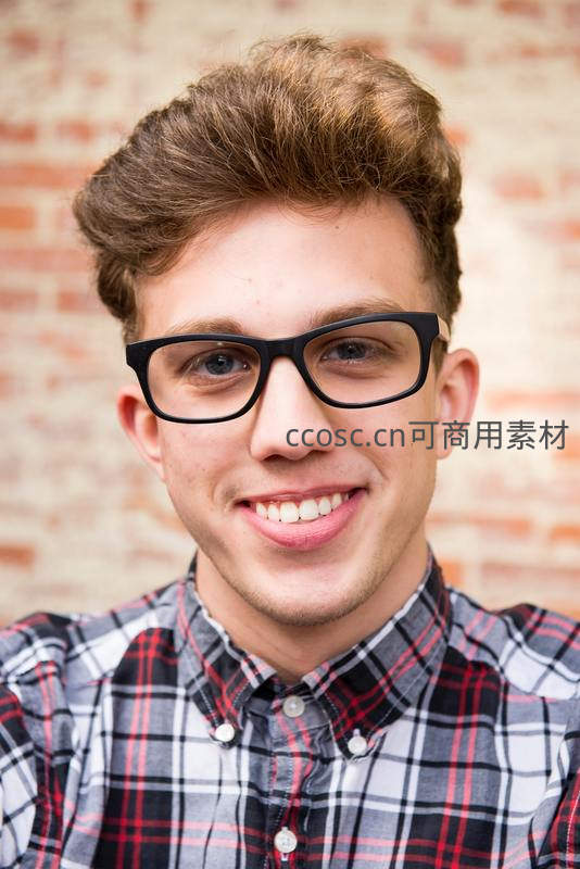 一位戴着黑色方框眼镜的年轻男子对着镜头露出灿烂笑容,身穿红黑白格子衬衫,背景是温暖的红砖墙,整体氛围轻松自然。