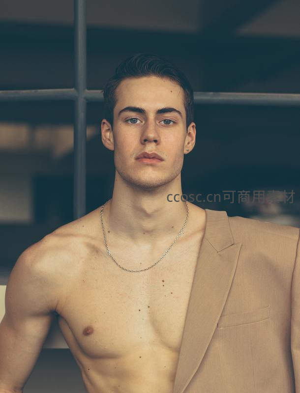 一位身材健硕的男子仅披着一件米色西装外套,佩戴简约项链,神情严肃地直视镜头,背景是模糊的工业风格窗户结构。