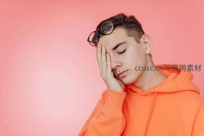 一名穿着鲜艳橙色连帽衫的年轻人闭眼扶额,表情疲惫,太阳镜推至头顶,背景为纯粉色,传达出压力或倦怠感。