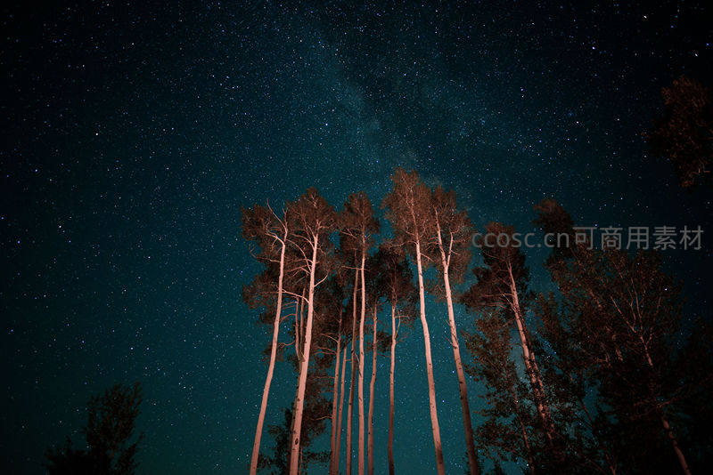 深邃夜空中繁星点点,高大松树的剪影直指苍穹,营造出静谧而壮丽的自然景象。
