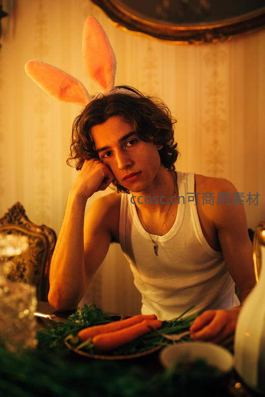 年轻男子头戴粉色兔耳,身穿白色背心,手托下巴坐在铺满绿叶和胡萝卜的餐桌前,背景是华丽复古墙面,氛围温馨又带点奇幻感。