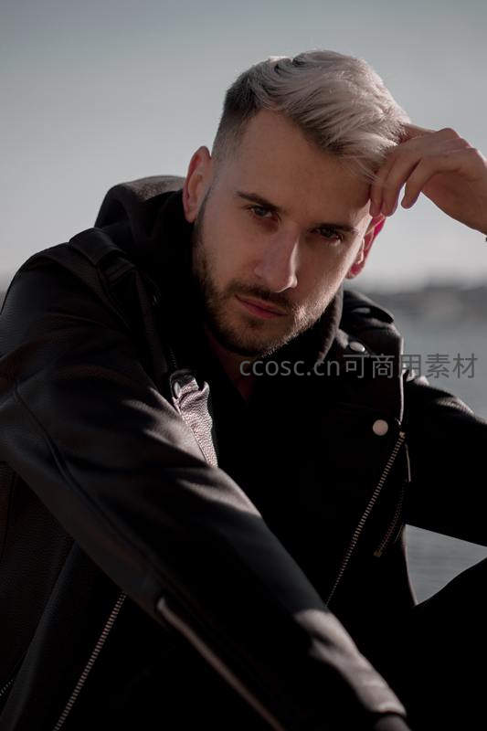 一位染着银灰色头发的男子身着黑色皮夹克,手扶额头凝视远方,背景是朦胧的海天一线,整体画面充满时尚感与沉静氛围。