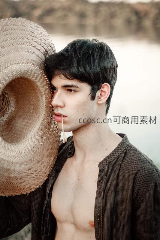 湖畔少年手持草帽侧颜特写