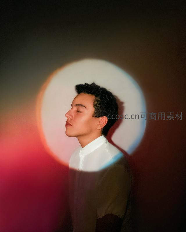 青年闭目伫立于柔和光斑之下,背景深邃,彩色光晕环绕头部,营造出梦幻而宁静的视觉效果,展现内心平和与艺术美感。