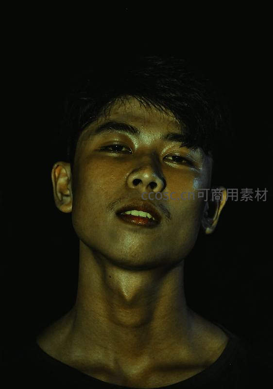 在纯黑背景下,一束戏剧性的灯光打在青年脸上,突显其轮廓与表情,营造出神秘、深邃且充满艺术感的视觉效果。