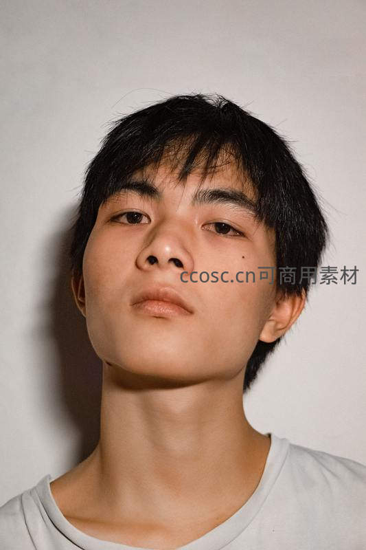 少年身穿白色T恤,在纯白背景前微微仰头,眼神清澈,光线柔和地勾勒出他的面部线条,展现青春的纯净与美好。