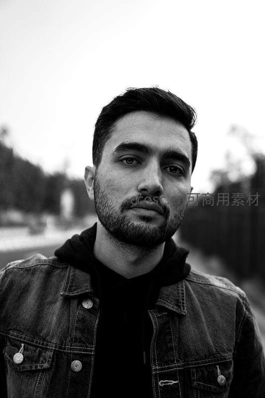 一位留着胡须的青年男子身穿牛仔夹克,在户外街道背景下直视镜头,黑白影调营造出沉静而有力量的视觉氛围。
