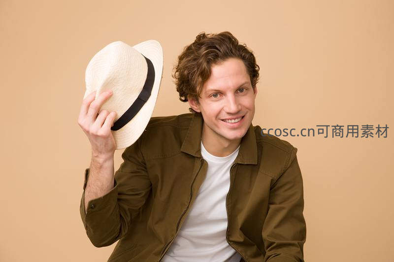 一位卷发男子面带微笑,手持一顶浅色草帽,身穿橄榄绿夹克内搭白色T恤,背景为柔和的米色,整体氛围轻松自然。