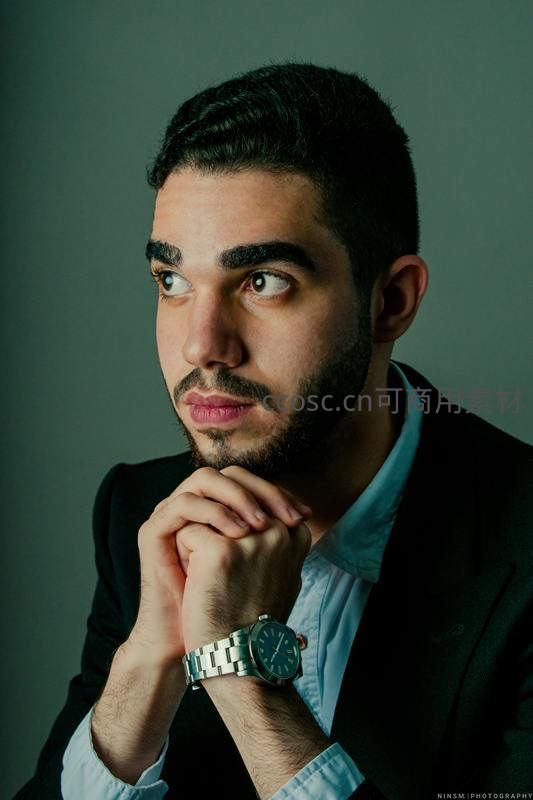 一位穿着黑色西装的男士,手托下巴,眼神专注地望向一侧,展现出沉思与专业的气质,腕表细节增添精致感。