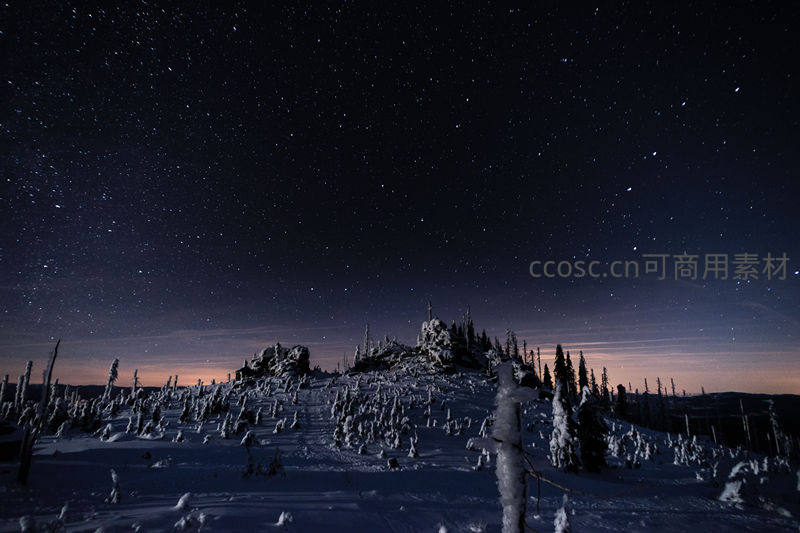 白雪覆盖的山丘在星光下银装素裹,稀疏的树木披上霜衣,展现极寒之地的纯净与壮美。