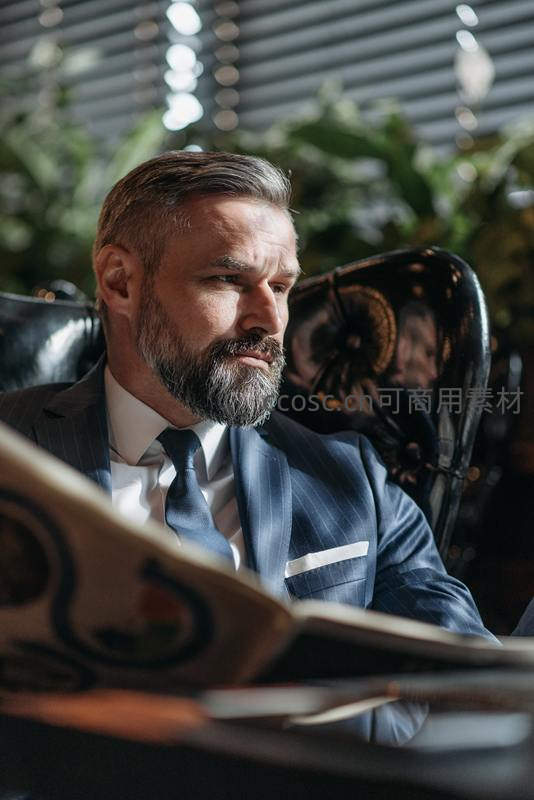 西装绅士阅读报纸办公场景