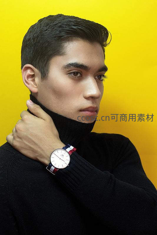 一位年轻男子身着黑色高领毛衣,佩戴时尚腕表,手轻抚衣领,眼神深邃凝望远方,背景为明亮的黄色,营造出强烈的视觉对比与艺术氛围。