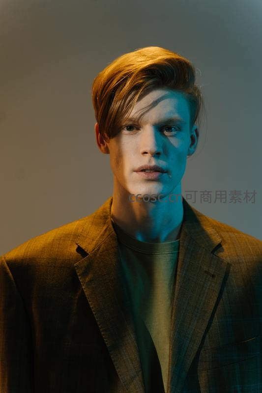 青年身穿格纹西装,在冷暖交织的灯光下展现出强烈的视觉对比,表情冷静,氛围前卫,极具艺术摄影张力。