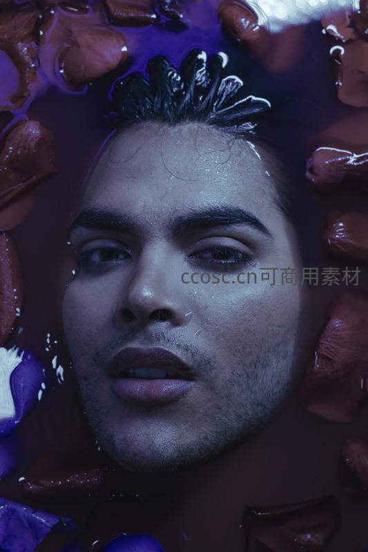 男子浸于紫蓝色光影与花瓣环绕的水中,眼神迷离,营造出如梦似幻的艺术氛围,极具视觉冲击力。
