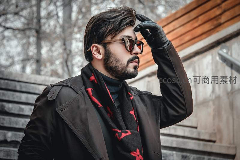 一位穿着黑色风衣、围着红黑图案围巾的男士,在城市台阶前回眸,一手轻扶墨镜,姿态优雅自信,尽显都市时尚与成熟魅力。