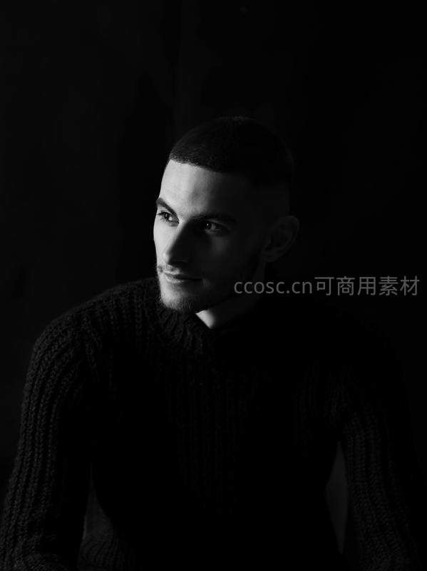在强烈的明暗对比下,一位穿着粗针织毛衣的男子侧脸凝视远方,营造出深邃、内敛且富有艺术感的视觉氛围。