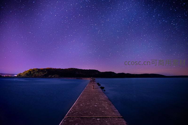 一条长长的水泥堤道延伸至幽蓝的湖心,头顶是布满繁星的紫色苍穹,水面平静如镜,映照着天上的点点星光。