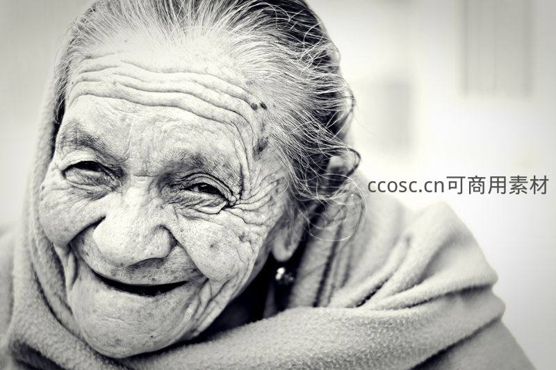 一张充满温情的黑白特写,一位满脸皱纹的老妇人裹着围巾,嘴角上扬露出温暖笑容,眼神柔和而慈祥。