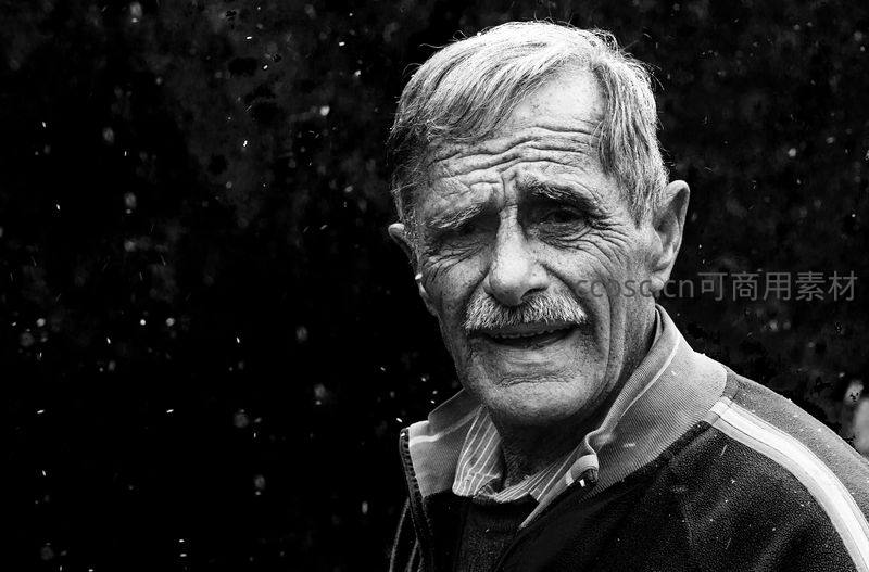 在飘洒的雨点背景下,一位留着小胡子的老者面带微笑凝视镜头,黑白画面更显其坚韧与从容的生活态度。